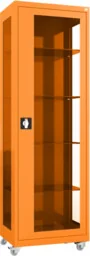 MDB/1k. 2011 mobilna szafa lekarska 1-skrzydłowa 1-komorowa w kolorze pomarańczowym RAL 2011 na kołach z przeszklonymi drzwiami i bokami Szafa lekarska 1-skrzydłowa wykonana z czarnej blachy stalowej lakierowanej proszkowo na kolor RAL 2011 (pomarańczowy głęboki). 1-komorowy korpus szafy posiada od frontu stalowe drzwi w typie witryny z przeszkleniami wykonanymi z bezpiecznego szkła hartowanego. Z tego samego szkła przeszklono również boki korpusu szafy. Drzwi osadzone są na zawiasach kołkowych i posiadają 3-punktowe ryglowanie zwalniane typowym dla wysokich frontów mebli zamkiem baskwilowym (bębenkowy, patentowy) z obracanym uchwytem klamkowym. Standardowym wyposażeniem szafy lekarskiej są 4 półki, których położenie można regulować w pionie przenosząc półkę na kolejne wsporniki umieszczone w narożnikach szafy.