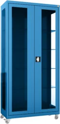MDB/2k. 5005 mobilna szafa lekarska 2-skrzydłowa 1-komorowa w kolorze niebieskim RAL 5005 na kołach z przeszklonymi drzwiami i bokami szafy Szafa lekarska 2-skrzydłowa wykonana z czarnej blachy stalowej lakierowanej proszkowo na kolor RAL 5005 (niebieski sygnałowy). 1-komorowy korpus szafy posiada od frontu 2 stalowe skrzydła drzwi w typie witryny z przeszkleniami wykonanymi z bezpiecznego szkła hartowanego. Z tego samego szkła przeszklono również boki korpusu szafy. Oba skrzydła drzwi osadzone są na zawiasach kołkowych, a każde z nich posiada 3-punktowe ryglowanie. Ryglowanie zwalniane jest typowym dla wysokich frontów mebli jednym zamkiem baskwilowym (bębenkowy, patentowy) z obracanym uchwytem klamkowym.