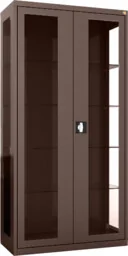 MDB/2s. 8017 wolnostojąca szafa lekarska 2-skrzydłowa 1-komorowa w kolorze brązowym RAL 8017 z przeszklonymi drzwiami i bokami szafy Wolnostojąca szafa lekarska 2-skrzydłowa wykonana z czarnej blachy stalowej lakierowanej proszkowo na kolor RAL 8017 (brązowy czekoladowy). 1-komorowy korpus szafy posiada od frontu 2 stalowe skrzydła drzwi w typie witryny z przeszkleniami wykonanymi z bezpiecznego szkła hartowanego. Z tego samego szkła przeszklono również boki korpusu szafy. Oba skrzydła drzwi osadzone są na zawiasach kołkowych, a każde z nich posiada 3-punktowe ryglowanie. Ryglowanie zwalniane jest typowym dla wysokich frontów mebli jednym zamkiem baskwilowym (bębenkowy, patentowy) z obracanym uchwytem klamkowym Standardowym wyposażeniem szafy lekarskiej są 4 półki, których położenie można regulować w pionie przenosząc półkę na kolejne wsporniki umieszczone w narożnikach szafy.