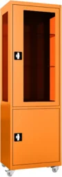 MDBW/1k. 2011 mobilna szafa lekarska 1-skrzydłowa 2-komorowa w kolorze pomarańczowym RAL 2011 na kołach z przeszkleniem górnych drzwi i boków górnej komory szafy Szafa lekarska 1-skrzydłowa z oddzielnie zamykaną górną i dolną komorą szafy, wykonana z czarnej blachy stalowej lakierowanej proszkowo na kolor RAL 2011 (pomarańczowy głęboki). Górna komora szafy posiada od frontu stalowe drzwi w typie witryny z przeszkleniem wykonanym z bezpiecznego szkła hartowanego. Z tego samego szkła przeszklono również boki górnej komory korpusu szafy. Dolna komora posiada pełne drzwi stalowe bez przeszklenia. Wszystkie drzwi osadzone są na zawiasach kołkowych.