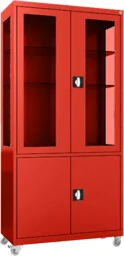 MDBW/2k. 3020 mobilna szafa lekarska 2-skrzydłowa 2-komorowa w kolorze czerwonym RAL 3020 na kołach z przeszklonymi górnymi drzwiami i bokami górnej komory szafy Szafa lekarska 2-skrzydłowa z oddzielnie zamykaną górną i dolną komorą szafy, wykonana z czarnej blachy stalowej lakierowanej proszkowo na kolor RAL 3020 (czerwony). Górna komora szafy posiada od frontu stalowe skrzydła drzwi w typie witryny z przeszkleniem wykonanym z bezpiecznego szkła hartowanego. Z tego samego szkła przeszklono również boki górnej komory korpusu szafy. Dolna komora posiada stalowe, pełne skrzydła drzwi bez przeszklenia. Wszystkie drzwi osadzone są na zawiasach kołkowych.