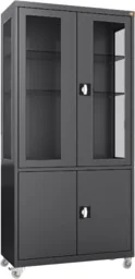 MDBW/2k. 9005 mobilna szafa lekarska 2-skrzydłowa 2-komorowa w kolorze czarnym RAL 9005 na kołach z przeszklonymi górnymi drzwiami i bokami górnej komory szafy Szafa lekarska 2-skrzydłowa z oddzielnie zamykaną górną i dolną komorą szafy, wykonana z czarnej blachy stalowej lakierowanej proszkowo na kolor RAL 9005 (czarny głęboki). Górna komora szafy posiada od frontu stalowe skrzydła drzwi w typie witryny z przeszkleniem wykonanym z bezpiecznego szkła hartowanego. Z tego samego szkła przeszklono również boki górnej komory korpusu szafy. Dolna komora posiada stalowe, pełne skrzydła drzwi bez przeszklenia. Wszystkie drzwi osadzone są na zawiasach kołkowych.