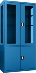 MDBW/2s. 5005 wolnostojąca szafa lekarska 2-skrzydłowa 2-komorowa w kolorze niebieskim RAL 5005 z przeszklonymi górnymi drzwiami i bokami górnej komory szafy Wolnostojąca szafa lekarska 2-skrzydłowa z oddzielnie zamykaną górną i dolną komorą szafy, wykonana z czarnej blachy stalowej lakierowanej proszkowo na kolor RAL 5005 (niebieski sygnałowy). Górna komora szafy posiada od frontu stalowe skrzydła drzwi w typie witryny z przeszkleniami wykonanymi z bezpiecznego szkła hartowanego. Z tego samego szkła przeszklono również boki górnej komory korpusu szafy. Dolna komora posiada pełne skrzydła drzwi bez przeszklenia. Wszystkie drzwi osadzone są na zawiasach kołkowych.