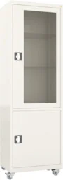 MDW/1k. 9010 mobilna szafa lekarska 1-skrzydłowa 2-komorowa w kolorze białym RAL 9010 na kołach z przeszklonymi górnymi drzwiami Szafa lekarska 1-skrzydłowa z oddzielnie zamykaną górną i dolną komorą szafy, wykonana z czarnej blachy stalowej lakierowanej proszkowo na kolor RAL 9010 (biały alpejski). Górna komora szafy posiada od frontu stalowe drzwi w typie witryny z przeszkleniem wykonanym z bezpiecznego szkła hartowanego. Dolna komora posiada pełne drzwi stalowe bez przeszklenia. Wszystkie drzwi osadzone są na zawiasach kołkowych. Każde skrzydło drzwi posiada 3-punktowe ryglowanie zwalniane umieszczonym w drzwiach zamkiem baskwilowym (bębenkowy, patentowy) z obracanym uchwytem klamkowym.