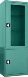 MDW/1s. 6033 wolnostojąca szafa lekarska 1-skrzydłowa 2-komorowa w kolorze miętowym RAL 6033 z przeszklonymi górnymi drzwiami Wolnostojąca szafa lekarska 1-skrzydłowa z oddzielnie zamykaną górną i dolną komorą szafy, wykonana z czarnej blachy stalowej lakierowanej proszkowo na kolor RAL 6033 (zielony miętowy). Górna komora szafy posiada od frontu stalowe drzwi w typie witryny z przeszkleniem wykonanym z bezpiecznego szkła hartowanego. Dolna komora posiada pełne drzwi stalowe bez przeszklenia. Wszystkie drzwi osadzone są na zawiasach kołkowych. Każde skrzydło drzwi posiada 3-punktowe ryglowanie zwalniane umieszczonym w drzwiach zamkiem baskwilowym (bębenkowy, patentowy) z obracanym uchwytem klamkowym.