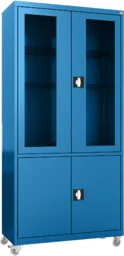 MDW/2k. 5005 mobilna szafa lekarska 2-skrzydłowa 2-komorowa w kolorze niebieskim RAL 5005 na kołach z przeszklonymi górnymi drzwiami Szafa lekarska 2-skrzydłowa z oddzielnie zamykaną górną i dolną komorą szafy, wykonana z czarnej blachy stalowej lakierowanej proszkowo na kolor RAL 5005 (niebieski sygnałowy). Górna komora szafy posiada od frontu stalowe skrzydła drzwi w typie witryny z przeszkleniem wykonanym z bezpiecznego szkła hartowanego. Dolna komora posiada stalowe, pełne skrzydła drzwi bez przeszklenia. Wszystkie drzwi osadzone są na zawiasach kołkowych. Każde skrzydło drzwi posiada 3-punktowe ryglowanie zwalniane umieszczonym w drzwiach zamkiem baskwilowym (bębenkowy, patentowy) z obracanym uchwytem klamkowym.