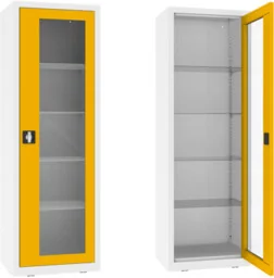 Shipping to countries: AT ; CZ ; EE ; SK ; LT ; LV ; Read more: Product shipping rules for European countries and product page translations NSML. 101. 9010. 1023 wolnostojąca szafa lekarska 1-skrzydłowa 1-komorowa z białym korpusem RAL 9010 i przeszklonymi drzwiami w ramie żółtej RAL 1023 Wolnostojąca szafa lekarska 1-skrzydłowa wykonana z czarnej blachy stalowej. 1-komorowy korpus szafy lakierowany proszkowo na kolor RAL 9010 (biel alpejska) posiada od frontu stalowe drzwi w typie witryny z przeszkleniem wykonanym z bezpiecznego szkła hartowanego typu float o grubości 4mm z ramą lakierowaną proszkowo na kolor RAL 1023 (żółty ostrzegawczy).