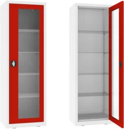 Shipping to countries: AT ; CZ ; EE ; SK ; LT ; LV ; Read more: Product shipping rules for European countries and product page translations NSML. 101. 9010. 3020 wolnostojąca szafa lekarska 1-skrzydłowa 1-komorowa z białym korpusem RAL 9010 i przeszklonymi drzwiami w ramie czerwonej RAL 3020 Wolnostojąca szafa lekarska 1-skrzydłowa wykonana z czarnej blachy stalowej. 1-komorowy korpus szafy lakierowany proszkowo na kolor RAL 9010 (biel alpejska) posiada od frontu stalowe drzwi w typie witryny z przeszkleniem wykonanym z bezpiecznego szkła hartowanego typu float o grubości 4mm z ramą lakierowaną proszkowo na kolor RAL 3020 (czerwony).