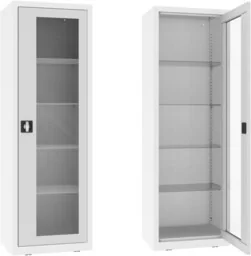 Shipping to countries: AT ; CZ ; EE ; SK ; LT ; LV ; Read more: Product shipping rules for European countries and product page translations NSML. 101. 9010. 7035 wolnostojąca szafa lekarska 1-skrzydłowa 1-komorowa z białym korpusem RAL 9010 i przeszklonymi drzwiami w ramie popielatej RAL 7035 Wolnostojąca szafa lekarska 1-skrzydłowa wykonana z czarnej blachy stalowej. 1-komorowy korpus szafy lakierowany proszkowo na kolor RAL 9010 (biel alpejska) posiada od frontu stalowe drzwi w typie witryny z przeszkleniem wykonanym z bezpiecznego szkła hartowanego typu float o grubości 4mm z ramą lakierowaną proszkowo na kolor RAL 7035 (popielaty jasny).