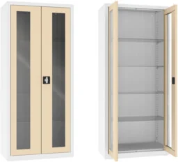 Shipping to countries: AT ; CZ ; EE ; SK ; LT ; LV ; Read more: Product shipping rules for European countries and product page translations NSML. 112. 9010. 1015 wolnostojąca szafa lekarska 2-skrzydłowa 1-komorowa z białym korpusem RAL 9010 i przeszklonymi skrzydłami drzwi w ramie beżowej RAL 1015 Wolnostojąca szafa lekarska 2-skrzydłowa wykonana z czarnej blachy stalowej. 1-komorowy korpus szafy lakierowany proszkowo na kolor RAL 9010 (biel alpejska) posiada od frontu dwa skrzydła stalowych drzwi w typie witryny z przeszkleniem wykonanym z bezpiecznego szkła hartowanego typu float o grubości 4mm z ramą lakierowaną proszkowo na kolor RAL 1015 (beżowy jasny).