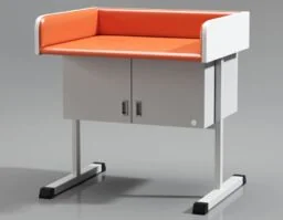 SBN-S wolnostojące stanowisko do badania i pielęgnacji niemowląt z szafką 2-drzwiową pod blatem Stanowisko do badania i przewijania niemowląt z tapicerowanym blatem zabiegowym i 2-drzwiową szafką pod blatem, wykonane w typie klasycznego przewijaka na konstrukcji z profili stalowych lakierowanych proszkowo zapewniającej stabilność podczas badania i zabiegów pielęgnacyjnych. Stanowisko wyposażone jest w wykonany z płyty meblowej blat zabiegowy o wymiarach zewnętrznych 96x75 cm (szerokość x głębokość) z doklejonymi od wewnątrz elementami chroniącymi niemowlę przez urazami (materacyk i boki), wykonanymi z pianki PU powleczonej atestowanym materiałem skóropodobnym poddającym się dezynfekcji. Wysokość od podłoża do blatu zabiegowego wynosi 79 cm przy całkowitej wysokości stanowiska 99 cm. Na wyposażeniu stanowiska znajduje praktyczna, 2-drzwiowa szafka na akcesoria lub kosmetyki do pielęgnacji niemowlęcia. Szafka o wymiarach zewnętrznych 70x35 cm (szerokość x głębokość) wykonana z laminowanej płyty meblowej.