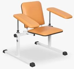 ST-02 stanowisko do pobierania krwi oraz zabiegów iniekcji i szczepień z obustronnymi podłokietnikami Stanowisko do pobierania krwi oraz do iniekcji wykonane na podstawie o konstrukcji z zamkniętych profili stalowych pokrytych lakierem proszkowym. Stanowisko posiada siedzisko zintegrowane z oparciem pleców i wyposażone jest w obustronne podłokietniki tapicerowane z regulacją w płaszczyźnie pionowej (wysokość) i w płaszczyźnie poziomej (obrót). Siedzisko i oparcie pleców oraz podłokietniki wypełnione są elastyczną pianką poliuretanową i pokryte tapicerką z atestowanego i zmywalnego materiału skóropodobnego poddającego się dezynfekcji. Charakterystyka i zalety stanowiska ST-02 do pobierania krwi i iniekcji stabilna konstrukcja zapewniająca bezpieczne wykonywanie zabiegów odpowiedni mebel medyczny do iniekcji i szczepień, pobierania krwi oraz wymazów, obustronne podłokietniki pozwalające na przeprowadzanie zabiegów na lewym lub prawym przedramieniu pacjenta tapicerowane siedzisko usytuowane na wysokości 47 cm od podłoża tapicerowane oparcie pleców tapicerowane podłokietniki z regulacją wysokości i obrotem atestowana tapicerka dostępna w wielu kolorach, zmywalna i poddająca się dezynfekcji elastyczna pianka PU wypełniająca elementy tapicerowane zaokrąglone narożniki elementów tapicerowanych maksymalne obciążenie do 120 kg certyfikowany wyrób medyczny darmowa dostawa na terenie Polski Wyrób medyczny zgodnie z wymaganiami zasadniczymi dla wyrobów medycznych w rozumieniu dyrektywy MDD 93/42/EEC oraz krajowej ustawy o wyrobach medycznych. Tapicerka stanowiska do pobierania krwi - kolorystyka i właściwości Tapicerka wykonana jest ze skóropodobnego materiału obiciowego produkowanego przez Sanwil Polska pod nazwą handlową Skaden B-353 dedykowanego do wyposażenia medycznego.