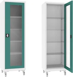 Shipping to countries: AT ; CZ ; EE ; SK ; LT ; LV ; Read more: Product shipping rules for European countries and product page translations XSML. 101. 9010. 6033 mobilna szafa lekarska 1-skrzydłowa 1-komorowa na kołach z białym korpusem RAL 9010 i przeszklonymi drzwiami w ramie zielonej RAL 6033 Mobilna szafa lekarska 1-skrzydłowa wykonana z czarnej blachy stalowej. 1-komorowy korpus szafy lakierowany proszkowo na kolor RAL 9010 (biel alpejska) posiada od frontu stalowe drzwi w typie witryny z przeszkleniem wykonanym z bezpiecznego szkła hartowanego typu float o grubości 4mm z ramą lakierowaną proszkowo na kolor RAL 6033 (zielony miętowy).