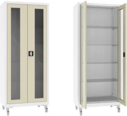 Shipping to countries: AT ; CZ ; EE ; SK ; LT ; LV ; Read more: Product shipping rules for European countries and product page translations XSML. 112. 9010. 7032 mobilna szafa lekarska 2-skrzydłowa 1-komorowa na kołach z białym korpusem RAL 9010 i przeszklonymi skrzydłami drzwi w ramie szarej RAL 7032 Mobilna szafa lekarska 2-skrzydłowa wykonana z czarnej blachy stalowej. 1-komorowy korpus szafy lakierowany proszkowo na kolor RAL 9010 (biel alpejska) posiada od frontu dwa stalowe skrzydła drzwi w typie witryny z przeszkleniem wykonanym z bezpiecznego szkła hartowanego typu float o grubości 4mm z ramami lakierowanymi proszkowo na kolor RAL 7032 (szary kamienisty).