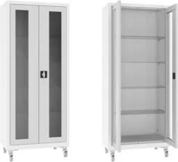 Shipping to countries: AT ; CZ ; EE ; SK ; LT ; LV ; Read more: Product shipping rules for European countries and product page translations XSML. 112. 9010. 7035 mobilna szafa lekarska 2-skrzydłowa 1-komorowa na kołach z białym korpusem RAL 9010 i przeszklonymi skrzydłami drzwi w ramie popielatej RAL 7035 Mobilna szafa lekarska 2-skrzydłowa wykonana z czarnej blachy stalowej. 1-komorowy korpus szafy lakierowany proszkowo na kolor RAL 9010 (biel alpejska) posiada od frontu dwa stalowe skrzydła drzwi w typie witryny z przeszkleniem wykonanym z bezpiecznego szkła hartowanego typu float o grubości 4mm z ramami lakierowanymi proszkowo na kolor RAL 7035 (popielaty jasny).