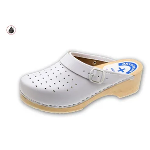 Na spodach drewnianych z profilem ortopedycznym, z cholewką skórzaną i podeszwą przeciwpoślizgową odporną na oleje, tłuszcze roślinne i zwierzęce. Wyposażone w pasek dwufunkcyjny przekładany na piętę.