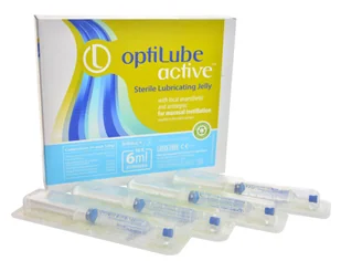UWAGA! Produkt przeznaczony wyłączanie dla podmiotów medycznych! sterylny lubrykant w żelu zapewniający optymalne smarowanie, miejscowe znieczulenie oraz posiadający właściwości antyseptyczne zmniejszające ryzyko infekcji działanie znieczulające trwa nawet do 30 minut żel nie zawiera lateksu i jest hipoalergiczny ampułkostrzykawka pozwala na stosowanie złotego standardu aseptycznej techniki bezdotykowej (ANTT) ampułkostrzykawka posiada nadrukowaną miarkę, co ułatwia nałożenie precyzyjnej ilości żelu Jak zmniejszyć ból pacjentki podczas badania? Żel OptiLube Active zawiera substancję znieczulającą miejscowo (lidokainę 2%) oraz substancję antyseptyczną (glukonian chlorheksydyny 0,25%). Żel OptiLube Active stosowany jest do płynnego, sterylnego i możliwie jak najbardziej bezbolesnego wkładania instrumentów lub cewników do jam ciała. Wykorzystuje się go często do zakładania cewników, wkładek domacicznych, rurek nosowo-gardłowych, wykonywania cystoskopii, histeroskopii, proktoskopii, sigmoidoskopii i kolonoskopii oraz innych procedur diagnostycznych. Każda strzykawka przeznaczona do jednorazowego użytku. Pojemność ampułkostrzykawki 6 ml.