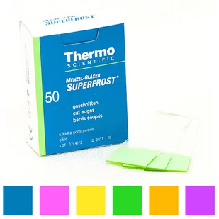 Wymiary szkiełka: 76 mm x 26 mm x 1 mm. Kraj produkcji: Niemcy Słowa kluczowe: szkiełka cytologiczne, cytologia, kolorowe pole do opisu