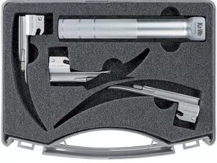 <strong>Bardzo profesjonalny,wysokiej jakości zestaw z tradycyjnym oświetleniem (ciepłym) z trzema łyżkami : Miller nr 00, Miller nr 0,Miller nr 1 z oświetleniem próżniowym oraz rękojeść rozmiar mały,na baterie. Całość w estetycznej walizce. <br/> </strong><br/> Wszystkie oferowane przez nas laryngoskopy niemieckiej firmy KaWe, specjalizującej się od ponad 110 lat w ich produkcji, wykonane zostały ze stali nierdzewnej, zmatowione w celu zapobiegania refleksom świetlnym. Karbowana rękojeść umożliwia pewny chwyt urządzenia.