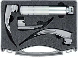 <strong>Bardzo profesjonalny,wysokiej jakości zestaw z tradycyjnym oświetleniem (ciepłym) z trzema łyżkami : Miller nr 0, MacIntosh nr 1 i MacIntosh nr 2 z oświetleniem próżniowym oraz rękojeść rozmiar średni,na baterie. Całość w estetycznej walizce. </strong><br /> Wszystkie oferowane przez nas laryngoskopy niemieckiej firmy KaWe, specjalizującej się od ponad 110 lat w ich produkcji, wykonane zostały ze stali nierdzewnej, zmatowione w celu zapobiegania refleksom świetlnym. Karbowana rękojeść umożliwia pewny chwyt urządzenia.