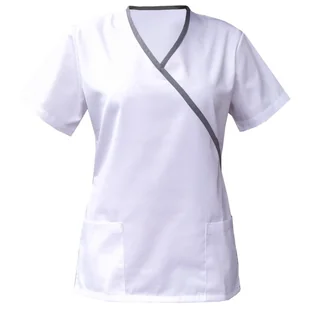 BLUZA MEDYCZNA DAMSKA BIAŁA LAMÓWKA SZARA Nasze bluzy to produkt skierowany do lekarzy, pielęgniarek, aptekarek, rehabilitantek, a także Pań z branży beauty (spa, wellness, kliniki medycyny estetycznej) Bluza wykonana jest z mocnej i wysokiej jakości tkaniny, zapewniającej trwałość i komfort noszenia, kolory naszej elanobawełny po wielokrotnym praniu - pozostają wciąż intensywne, a rozmiar stabilny. Bluza medyczna posiada dwie kieszenie oraz lamówkę. Tkanina jest elastyczna i przewiewna, nie krępuje ruchów co jest ważne przy długim dniu pracy. Charakterystyka BLUZY: bluza wkładana przez głowę krótki rękaw bluza z lamówką wiązana z tyłu - trok dwie kieszenie naszywane na wysokości bioder fason taliowany - podkreśla wcięcie w talii tkanina: