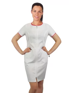 SUKIENKA MEDYCZNA KOSMETYCZNA M23 Kolor biały z lamówką w kolorze amarant Nasze sukienki to produkt skierowany do Pań pielęgniarek, położnych, aptekarek, a także Pań z branży beauty (spa, wellness, kliniki medycyny estetycznej) Sukienka wykonana jest z mocnej i wysokiej jakości tkaniny, zapewniającej trwałość i komfort noszenia, kolory naszej elanobawełny po wielokrotnym praniu - pozostają wciąż intensywne, a rozmiar stabilny. Tkanina jest elastyczna i przewiewna. Charakterystyka sukienki: sukienka taliowana zapinana na suwak z przodu rękaw krótki, dwie kieszenie na wysokości bioder zamek góra/dół długość dopasowana do rozmiaru tkanina: 35% bawełna, 65% poliester dostępna w rozmiarach od 34 do 50 sukienka dostępna w inntch wariantach kolorystycznych