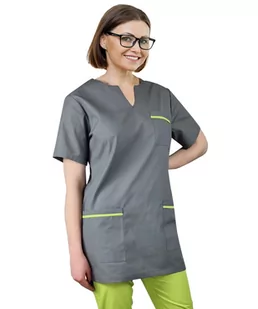 TUNIKA MEDYCZNA KOLEKCJA CLINIC Kolor: szara - lamówka limonka Medyczna tunika damska, to produkt skierowany dla Pań, które poszukują dłuższej wersji bluzy medycznej. Długość tuniki idealnie zakrywa 3/4 pośladków. Trzy kieszenie sprawia że wszystkie drobiazgi w codziennej pracy będą przy Tobie. Tunika medyczna dla pracowników medycznych zakładana jest przez głowę, w zakładaniu tuniki pomogą rozporki umieszczono po bokach.