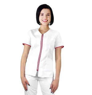 ŻAKIET MEDYCZNY na suwak Kolor biały z lamówką amarant Nasze żakiety z serii COSMETIC produkujemy z celem połączenia zalet ubrania roboczego oraz nowoczesnego designu, który nadają kolorowe lamówki. Szyjąc nasze stroje mamy na celu nadążać za dzisiejszą modą Nasze żakiety to produkt skierowany do Pań pielęgniarek, położnych, aptekarek, a także dla Pań z branży beauty (spa, wellness, kliniki medycyny estetycznej) Żakiet wykonany jest z mocnej i wysokiej jakości tkaniny, zapewniającej trwałość i komfort noszenia, kolory naszej takniny po wielokrotnym praniu - pozostają wciąż intensywne, a rozmiar stabilny. Tkanina jest elastyczna i przewiewna. Charakterystyka żakietu: żakiet taliowany zapinany na suwak z przodu rękaw krótki, dwie kieszenie na wysokości bioder i jedna na lewej piersi dekolt okrągły, zamek oraz rygle na kieszonkach w kontrastującym kolorze.