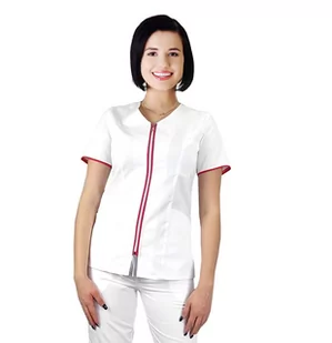 ŻAKIET MEDYCZNY na suwak Kolor biały z lamówką amarant Nasze żakiety z serii COSMETIC produkujemy z celem połączenia zalet ubrania roboczego oraz nowoczesnego designu, który nadają kolorowe lamówki. Szyjąc nasze stroje mamy na celu nadążać za dzisiejszą modą Nasze żakiety to produkt skierowany do Pań pielęgniarek, położnych, aptekarek, a także dla Pań z branży beauty (spa, wellness, kliniki medycyny estetycznej) Żakiet wykonany jest z mocnej i wysokiej jakości tkaniny, zapewniającej trwałość i komfort noszenia, kolory naszej takniny po wielokrotnym praniu - pozostają wciąż intensywne, a rozmiar stabilny. Tkanina jest elastyczna i przewiewna. Charakterystyka żakietu: żakiet taliowany zapinany na suwak z przodu rękaw krótki, dwie kieszenie na wysokości bioder i jedna na lewej piersi dekolt okrągły, zamek oraz rygle na kieszonkach w kontrastującym kolorze.