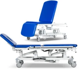 StEL. 31R stół rehabilitacyjno-zabiegowy 3-częściowy z elektryczną regulacją wysokości sterowaną pilotem ręcznym oraz regulowanym pneumatycznie zagłówkiem i leżem do funkcji fotela Stół stacjonarny rehabilitacyjno-zabiegowy wyposażony w elektryczną regulację wysokości przewodowym pilotem ręcznym. Stół StEL. 31R oferuje 3-częściowe leże z zagłówkiem regulowanym pneumatycznie (sprężyna gazowa) w zakresie +/- oraz nieruchomą sekcją piersiową i podnoszoną pneumatycznie (sprężyny gazowe) sekcją lędźwiowo-nożną (oparcie pleców przy funkcji fotela). Wypełnienie leża wykonano z pianki PU wysokiej jakości. Leże pokryte jest bezszwową tapicerką z atestowanego materiału skóropodobnego w wielu kolorach do wyboru. Zagłówek może być wyposażony w otwór do oddychania z wyjmowaną zatyczką.
