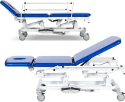StEL. 32N stół rehabilitacyjno-zabiegowy 3-częściowy z nożną elektryczną regulacją wysokości i regulowanym elektrycznie zagłówkiem oraz podnoszonym leżem do funkcji fotela Stół stacjonarny rehabilitacyjno-zabiegowy wyposażony w elektryczną regulację wysokości przewodowym pilotem nożnym. Stół StEL. 32N oferuje 3-częściowe leże z zagłówkiem regulowanym elektrycznie w zakresie +/- pilotem nożnym oraz nieruchomą sekcją piersiową i podnoszoną pneumatycznie (sprężyny gazowe) sekcją lędźwiowo-nożną (oparcie pleców przy funkcji fotela). Wypełnienie leża wykonano z pianki PU wysokiej jakości. Leże pokryte jest bezszwową tapicerką z atestowanego materiału skóropodobnego w wielu kolorach do wyboru. Zagłówek może być wyposażony w otwór do oddychania z wyjmowaną zatyczką.