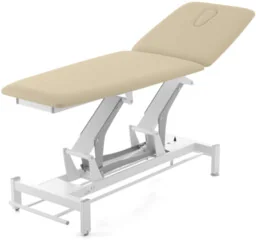 Elektryczna regulacja wysokości, w którą wyposażony jest stół, umożliwia opuszczenie leża stołu do poziomu siedziska wózka inwalidzkiego, dzięki czemu samodzielna osoba niepełnosprawna poruszająca się na wózku inwalidzkim jest w stanie przesiąść się na blat leża stołu bez pomocy osób trzecich, jak również bez pomocy specjalistycznych podnośników pacjenta. Następnie terapeuta może przy pomocy ramy sterującej wysokością podnieść stół rehabilitacyjny wraz z niepełnosprawnym pacjentem do poziomu odpowiedniego dla zastosowania danej terapii w zakresie dostępnej regulacji wysokości oraz do wymagań ergonomii pracy rehabilitanta. W standardzie leże bez systemu podgrzewania atestowana tapicerka zmywalna z palety Standard wypełnienie leża pianką PU o grubości 4 cm Opcjonalne wyposażenie dodatkowe objęte dopłatą leże z elektrycznym podgrzewaniem wypełnienie leża pianką PU o grubości 5 cm atestowana tapicerka zmywalna z palety Premium 2 barkowe banany stabilizujące opuszczane barierki lub poręcze boczne zabezpieczające pacjenta albo relingi boczne do zapinania pasów stabilizujących pasy do stabilizacji pacjenta (długość ok. 2,5 m) wybrany wieszak na podkłady higieniczne w rolkach: zintegrowany z leżem - na rolki podkładów ø16 cm i szerokości max 60 cm zintegrowany z ramą dolną - na rolki podkładów ø14 cm i szerokości max 60 cm podpórka Cyriax pod nogi terapeuty stosowana przy manipulacji szyjnej Tapicerka stołu rehabilitacyjnego - paleta Standard Wysokiej jakości funkcjonalny materiał obiciowy typu skóra ekologiczna o podwyższonej odporności na ciecze (olejki, woda, solanki) i na płyny ustrojowe (krew, pot, mocz). Odporny na działanie wysokich temperatur, wysoce wytrzymały i odporny na zadrapania.