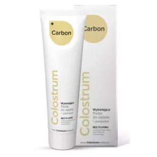 Colostru. Pasta do zębów Colostrum CARBON 75 mlPasta do zębów Colostrum Carbon to wyjątkowy produkt, który łączy moc natury z zaawansowaną ochroną Twojej jamy ustnej. Zawiera colostrum, które jest bogate w białka odpowiedzialne za działanie przeciwbakteryjne, przeciwgrzybicze i przeciwzapalne. Dzięki laktoperoksydazie, naturalnie występującemu enzymowi, pasta zapewnia skuteczną ochronę przeciwbakteryjną, działając na próchnicę i dziąsła. Colostrum Carbon to pasta do zębów wzbogacona o prebiotyk, który wspiera rozwój korzystnych bakterii, pomagając w utrzymaniu zdrowej flory bakteryjnej jamy ustnej. Nie zawiera fluoru, co czyni ją idealną dla osób, które preferują produkty bez tego składnika.