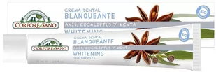 Corpore Sano Natural Extract-Anise Eucalyptus and Mint to pasta do zębów o matowej formule z naturalnymi ekstraktami roślinnymi, które pomagają wybielić zęby. Zawiera enzymy proteolityczne, które rozpuszczają ciemną płytkę nazębną na zębach oraz fluorek sodu, który wzmacnia szkliwo zębów. Pasta ma przyjemny miętowo-anyżowo-eukaliptusowy smak. Wybielająca pasta do zębów. Zawiera naturalne ekstrakty, które pomagają rozjaśnić przebarwione zęby.