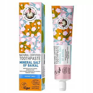 Eurobio Lab to wschodnioeuropejski producent kosmetyków opartych na naturalnych i organicznych składnikach. Receptury Babuszki Agafii to linia kosmetyków oparta na staranie wyselekcjonowanych Syberyjskich ziołach. Pasta do zębów Mineralna Sól z Bajkału - Promienny uśmiech. Pasta do zębów Babuszki Agafii zawiera 5 unikalnych olejków syberyjskich oraz sól mineralną. Składniki te pomagają wygładzić niedoskonałości na powierzchni zębów, przywracając im naturalny połysk i zapewniając promienny uśmiech. Pasta do zębów Mineral Salt of Baikal - Radiant Smile posiada certyfikaty: Ecocert Cosmos Natural i Vegan. Certyfikat ECOCERT oznacza, że w produkcie nie ma syntetycznych substancji zapachowych i barwiących, silikonów, parafiny i innych składników ropopochodnych. COSMOS Natural oznacza, że w produkcie znajduje się minimum 95% składników naturalnego pochodzenia. Produkt posiada oznaczenie Vegan nadawane przez Towarzystwo Wegańskie. Oznacza to, że w produkcie nie ma składników pochodzenia zwierzęcego - nawet mleka lub miodu. Oprócz tego produkt ani jego składniki nie były testowane na zwierzętach.