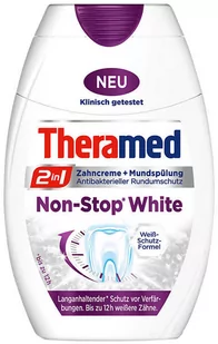 Theramed 2w1 to połączenie pasty i płynu do płukania ust. Theramed 2in1 Oxy White dzięki nowej formule z tlenem zapewnia białe zęby i świeży oddech. Kombinacja pasty do zębów i płynu do płukania umożliwia efektywną i kompletną ochronę przed chorobami zębów i dziąseł. Innowacyjna formuła zapewnia długotrwałą ochronę i świeżość płynu do płukania ust - bezpośrednio podczas mycia zębów. Pojemność: 75 ml