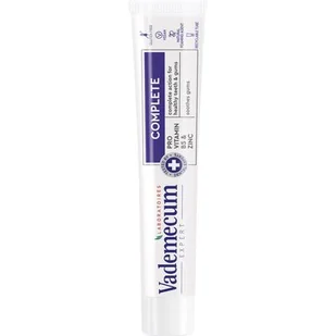 VADEMECUM ProVitamin Complex Complete Pasta do zębów - zapewnia pełną ochronę - chroni zewnętrzną strukturę zęba - tylko dla dorosłych Zapewnia pełną ochronę 360 dla zdrowych zębów, dziąseł i śluzówki*. W jego formule obecny jest siarczan cynku i glicerofosforan wapnia. Siarczan cynku ma działanie antybakteryjne oraz wiąże związki siarki, odpowiedzialne za nieprzyjemny oddech. Z kolei glicerofosforan wapnia jest źródłem łatwo przyswajalnego wapnia, ważnym dla remineralizacji szkliwa, chroniącego zewnętrzną strukturę zęba. Zawiera fluorek sodu 1450 ppm F.