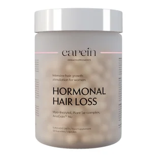 Carein Hormonal Hair Loss Kapsułki, 120 szt. Hormonal Hair Loss to specjalistyczny dermosuplement trychologiczny przeznaczony dla kobiet zmagających się z łysieniem androgenowym. Formuła hamuje aktywność dihydrotestosteronu (DHT), jednego z głównych czynników odpowiedzialnych za utratę włosów, a jednocześnie stymuluje i przyspiesza ich odrost. Zawiera naturalne inhibitory 5α-reduktazy, takie jak katechiny zielonej herbaty, astaksantyna, kurkumina, rdestowiec ostrokolczysty, ekstrakt z nasion lnu