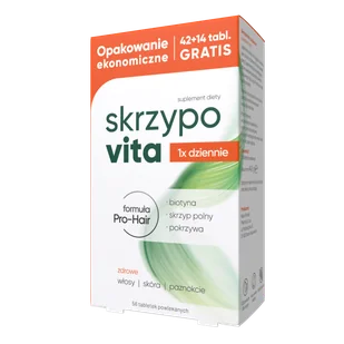 Produkt Skrzypovita 1 x dziennie, 42 tabletki powlekane + 14 tabletek gratis do kupienia w Gemini. Skrzypovita 1 x dziennie to suplement diety będący kompozycja składników naturalnych składników roślinnego pochodzenia, siedmiu ...