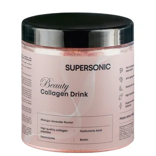 SUPERSONIC Beauty Drink Mango 185 g (25 porcji)Wyglądaj młodziej i zatrzymaj oznaki starzenia skóry!Unikalny kolagen nowej generacji. Zawiera opatentowany hydrolizat kolagenu rybiego Peptan®, którego skuteczne działanie poparte jest badaniami klinicznymi. Ma działanie odmładzające – spłyca Twoje zmarszczki, zapobiega utracie elastyczności i daje efekt sprężystej skóry. Cechuje się znakomitą przyswajalnością, dzięki czemu w niedługim czasie zobaczysz efekty. Dzięki zawartości elektrolitów (magnez i p