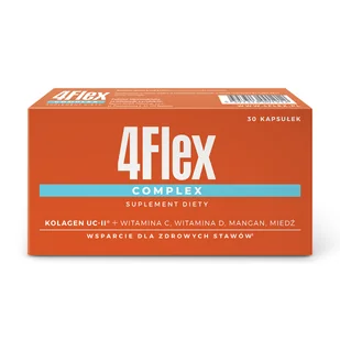 4Flex Complex – wsparcie stawów, kości i tkanek łącznych w jednej kapsułce4Flex Complex to suplement diety opracowany z myślą o osobach aktywnych, starszych, z siedzącym trybem życia lub nadwagą – czyli wszystkich, którzy chcą zadbać o prawidłowe funkcjonowanie układu ruchu. Zawiera niezdenaturowany kolagen typu II UC-II®, a także witaminę C, witaminę D, miedź i mangan, które wspierają kondycję stawów, kości, ścięgien oraz torebek stawowych. Co zawiera 4Flex Complex?✔ Kolagen UC-II® – niezdenatur