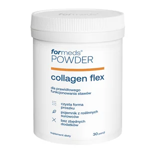 Formeds Powder Collagen Flex Proszek, 153 gPOWDER Collagen Flex to połączenie wołowych peptydów kolagenowych (5 000 mg) o masie cząsteczkowej poniżej 2500 Da oraz witaminę C (100 mg), które razem wspierają prawidłowe funkcjonowanie układu kostno-stawowego oraz zdrowy wygląd skóry. Linia POWDER to suplementy diety w czystej formie proszku bez zbędnych dodatków. Właściwości składników: Kolagen w formie peptydów o niskiej masie cząsteczkowej (<2500 Da) cechuje się wysoką przyswajalnością i naturalnie