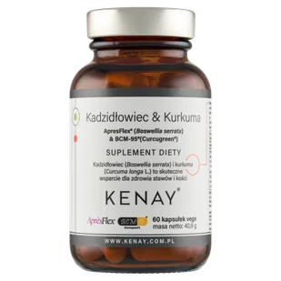 Produkt Kenay Kadzidłowiec & Kurkuma ApresFlex & BCM 95, 60 kapsułek do kupienia w Gemini. Kenay Kadzidłowiec & Kurkuma to suplement diety w kapsułkach przeznaczony do uzupełniania codziennej diety osób dorosłych. Zawiera . . .