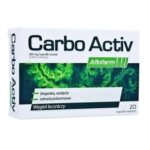 Wskazania: zatrucia pokarmowe, biegunki, pomocniczo w przypadku wzdęć, zatrucia substancjami chemicznymi i lekami. Skład: 1 kapsułka zawiera 200mg węgla leczniczego; pozostałe składniki: żelatyna, tytanu dwutlenek (E171), żółcień chinolowa (E104), indygotyna (E132). Działanie: adsorbcyjne. Dawkowanie: zalecane dawkowanie: dorośli i dzieci powyżej 12 lat w lżejszych zatruciach pokarmowych objawami wzdęć lub nadmiernej fermentacji jelitowej podaje się doustnie 4 do 6 kapsułek kilka razy na dobę, aż do ustąpienia objawów. W cięższych przypadkach biegunki zawartość torebki wsypać do niewielkiej ilości wody i przyjmować w postaci zawiesiny co godzinę do ustąpienia objawów (3 lub 4 razy). W przypadku zatruć chemicznych i w zatruciach lekami przyjąć niezwłocznie 10 kapsułek węgla, popijać wodą, a następnie powtórzyć tą dawkę kilkakrotnie. Natychmiast zawiadomić lekarza, który zdecyduje o dalszym postępowaniu. W cięższych zatruciach podaje się jednorazowo 4g do 10g wegla aktywnego (zawartość 20 do 50 kapsułek w postaci zawiesiny w wodzie. Zawiesinę można podawać sondą żołądkową podczas płukania żołądka. Dzieci powyżej 1 roku życia w przypadku zatruć lekami lub substancjami chemicznymi podaje się zwykle jednorazowo 10 do 20 kapsułek. Dla dzieci poniżej 6. roku życia należy wsypać do niewielkiej ilości wody i podać w postaci zawiesiny. Przeciwwskazania: uczulenie na węgiel aktywny lub na którykolwiek z pozostałych składników leku; jeśli pacjent jest nieprzytomny i nie zabezpieczono mu dróg oddechowych,; u niemowląt; węgla aktywnego nie należy stosować w przypadku zatruć substancjami nie adsorbowanymi, m.in. rozpuszczalnikami, substancjami żrącymi, metalami ciężkimi, alkoholami niespożywczymi.