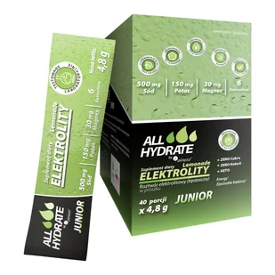 Allhydrate Elektrolity Stick Junior Smak Lemonade, 40 saszetekSuplement diety w formie wygodnych saszetek, stworzony z myślą o dzieciach. Pomaga uzupełniać płyny i elektrolity, wspierając nawodnienie organizmu w trakcie upałów, aktywności fizycznej lub podczas osłabienia. Delikatny, cytrynowy smak Lemonade zachęca do regularnego stosowania. Zalety produktu: Dla dzieci – łagodna formuła dostosowana do potrzeb najmłodszychZawiera elektrolity: