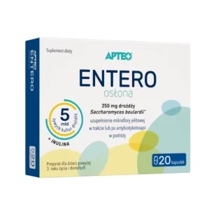 APTEO ENTERO OSŁONA - SUPLEMENT DIETY ZAWIERA 5 MLD ŻYWYCH KULTUR DROŻDŻY + INULINĘ, STOSUJE SIĘ W CELU UZUPEŁNIENIA MIKROFLORY JELITOWEJ.