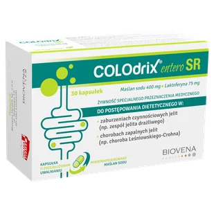 Produkt Colodrix entero SR, 30 kapsułek do kupienia w Gemini. Colodrix® entero SR to żywność specjalnego przeznaczenia medycznego w postaci kapsułek zawierająca mikrootoczkowany maślan sodu oraz laktoferynę.