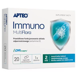 Suplement diety APTEO IMMUNO MULTIFLORA to preparat pomagający utrzymać prawidłowe funkcjonowanie układu odpornościowego, oraz prawidłowej flory bakteryjnej. W preparacie Immuno MultiFlora zastosowano opatentowaną technologię DRcaps. Dzięki niej zawartość kapsułki ochroniona jest przed działaniem kwasu solnego w żołądku. Technologia DRcaps zapewnia zwiększoną ochronę zawartości kapsułki przed działaniem wilgoci i kwasu żołądkowego. Wystarczy 1 kapsułka 1 raz dziennie.