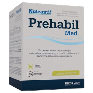 Produkt Olimp Nutramil PreHabil Med, preparat odżywczy, smak cytrynowy, 6 saszetek do kupienia w Gemini. Olimp Nutramil PreHabil Med to specjalistyczny preparat odżywczy w formie proszku o smaku cytrynowym, przeznaczony do ...