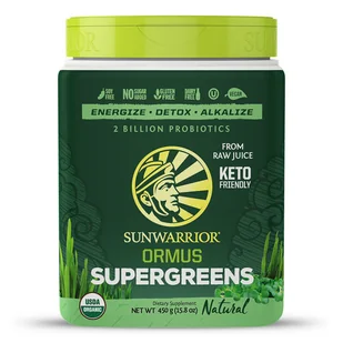 Sunwarrior Ormus Super Greens Bio - Naturalny Ormus to zielony napój pełen „superzielonych”, czyli zielonych pokarmów bogatych w substancje biologicznie czynne i fitoskładniki . Jest to zbilansowana mieszanka suszonych soków z młodych pędów , łącząca zalety poszczególnych ziół, zmielonych suszonych młodych pędów , probiotyków i prebiotyków. Zielone wierzchołki lucerny, młodego jęczmienia, młodej pszenicy, młodego owsa i moringi kryją największy potencjał świeżo wyhodowanej rośliny. Dzięki opatentowanej technologii przetwarzania, żywność zielona jest lekkostrawna, a wszystkie składniki odżywcze doskonale biodostępne. W JAKIM SUPER GREENS ORMUS JEST TAK WSPANIAŁY? Dzięki mieszance soków z młodych traw, probiotyków, skutecznych enzymów roślinnych, błonnika i korzenia imbiru harmonizuje i uspokaja trawienie .